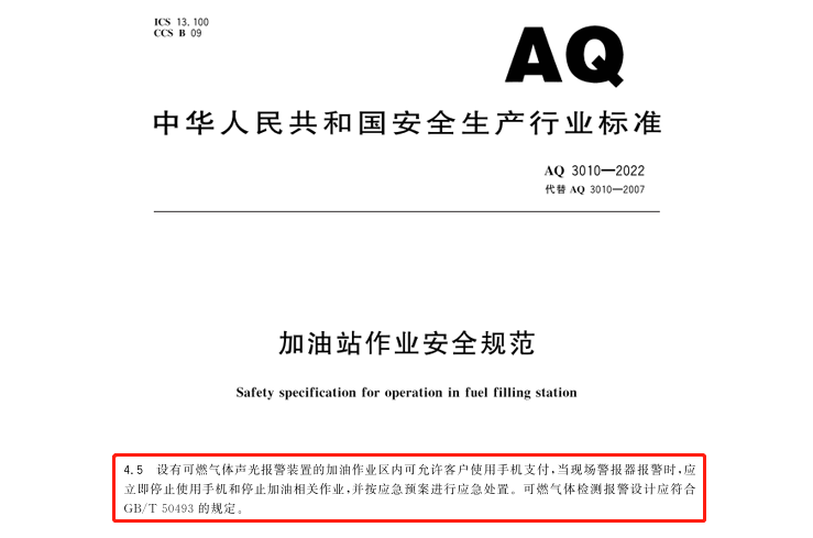 在新版《加油站作业安全规范》基本要求中,删除了“加油站内不应使用移动通讯设备 ”,增加了关于手机扫码支付活动的安全要求。其描述为“设有可燃气体声光报警装置的加油作业区内可允许客户使用手机支付,当现场警报器报警时,应立即停止使用手机和停止加油相关作业,并按应急预案进行应急处置。”这就意味着,在安装可燃气体报警器(带声光报警)未报警的情况下,可进行手机支付。