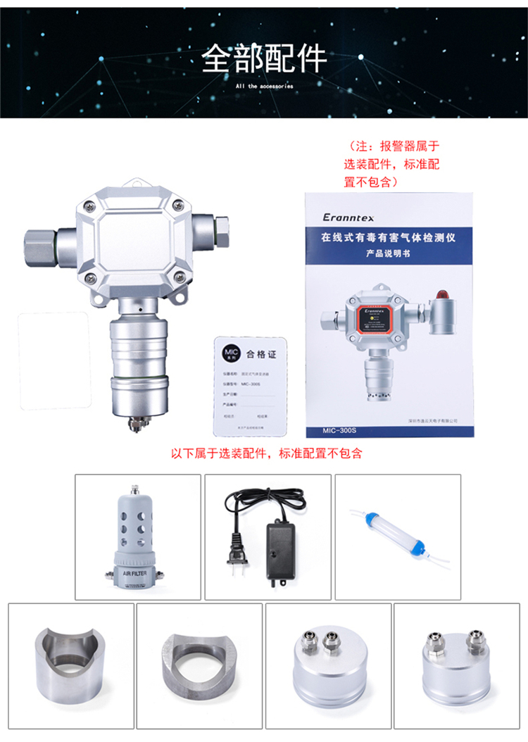 选配附件 一体式声光报警器、分体式声光报警器、24V直流稳压电源、连电脑监控的配件:上位机软件、RS485/RS232转换器、 USB/RS232 转换连接线、 TCP/IP转换器